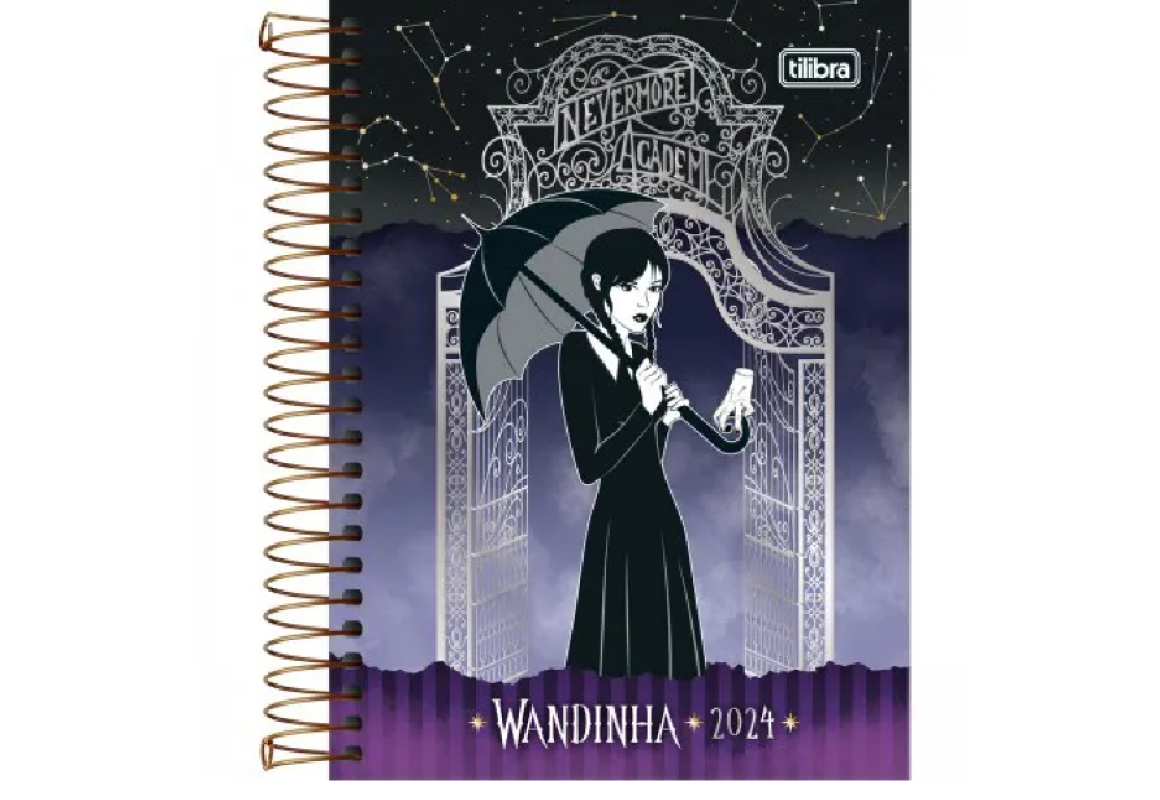 Apresentando a Agenda Espiral Diária Wandinha 2024, no tamanho compacto de 11,7 x 16,4 cm. Explore uma página por dia, de segunda a sexta, para planejar com praticidade. Com capa dura resistente e uma bolsa plástica inteligente para suas notas e tarefas. A solução ideal para manter sua rotina organizada e fluindo sem esforço.